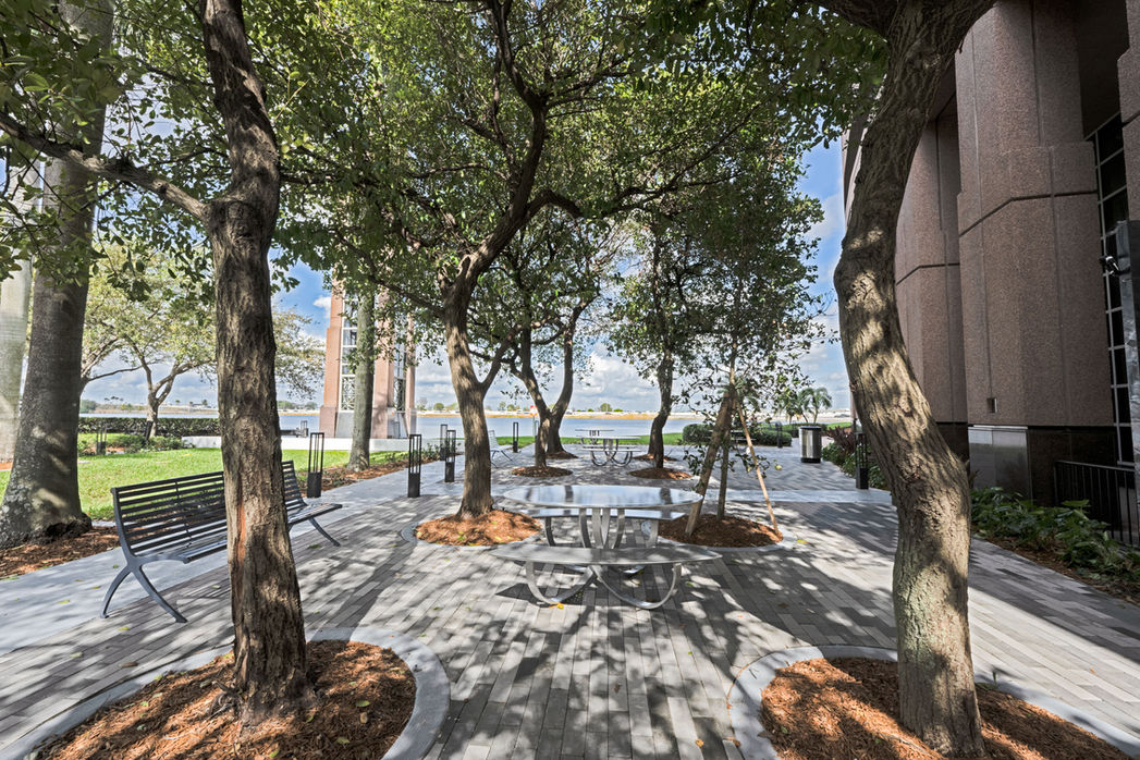 The exterior courtyard at 5201 Waterford District Drive in Miami's Waterford Business District has been newly renovated. Enhancements include upgraded pedestrian pathways, modern exterior benches, improved seating areas, upgraded lighting, and refreshed landscaping, creating a more inviting and functional outdoor space for this commercial office building.
